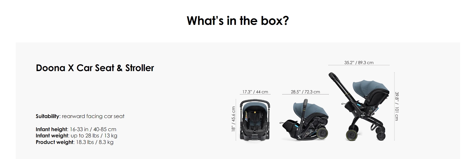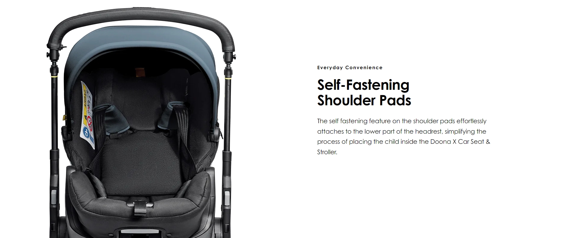 ชุดผลิตภัณฑ์นี้ประกอบด้วย Doona X ซึ่งเป็นคาร์ซีทนวัตกรรมที่สามารถเปลี่ยนเป็นรถเข็นเด็กขนาดกะทัดรัดได้อย่างง่ายดาย Doona X นำเสนอการปรับเอนได้สามตำแหน่ง รวมถึงการปรับนอนราบ เพื่อให้ลูกน้อยของคุณนอนหลับและผ่อนคลายได้อย่างสบายที่สุดในโหมดรถเข็นเด็ก และยังคงเป็นคาร์ซีทที่ตรงตามข้อกำหนดด้านความปลอดภัย i-Size ของยุโรป (R-129) มาพร้อมกับสายรัดและพนักพิงศีรษะแบบปรับได้ในตัว เพื่อความปลอดภัยและความสะดวกสบายสูงสุด Doona X ยังมีส่วนเสริม Doona SIP ซึ่งให้การป้องกันแรงกระแทกด้านข้างที่ได้รับการปรับปรุง